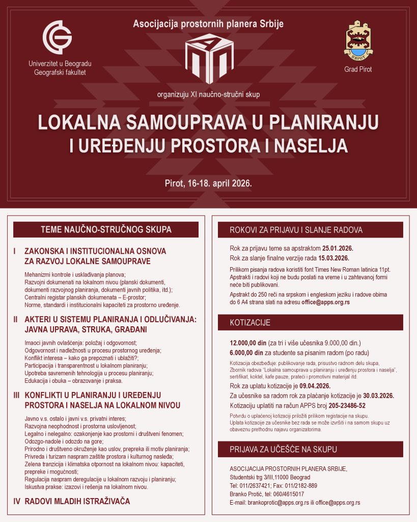 Асоцијација просторних планера Србије и Универзитет у Београду – Географски факултет организују XI научно-стручни скуп са међународним учешћем „Локална самоуправа у планирању и уређењу простора и насеља“, који ће се одржати од 16. до 18. априла 2026. године у Пироту.